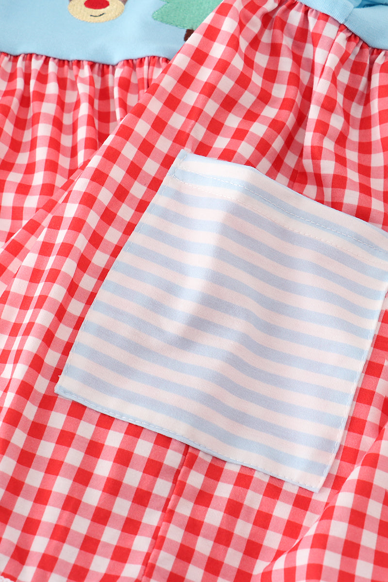 Celebrate the holiday spirit with this delightful blue dress adorned with charming deer, trees, and Santa embroidery. Playfully detailed with soft ruffles, it’s perfect for little ones to twirl in while spreading festive cheer. Comfortable and cute, this dress brings joy to any seasonal occasion.